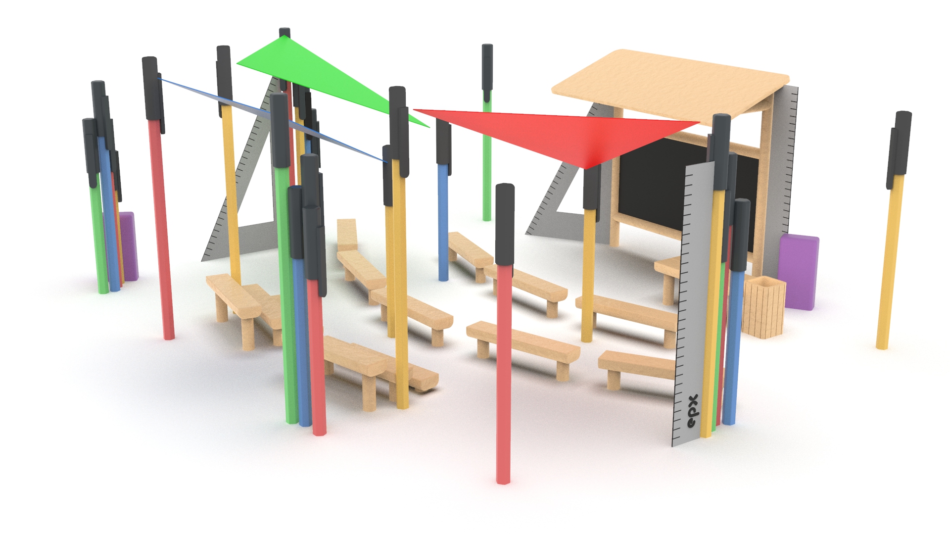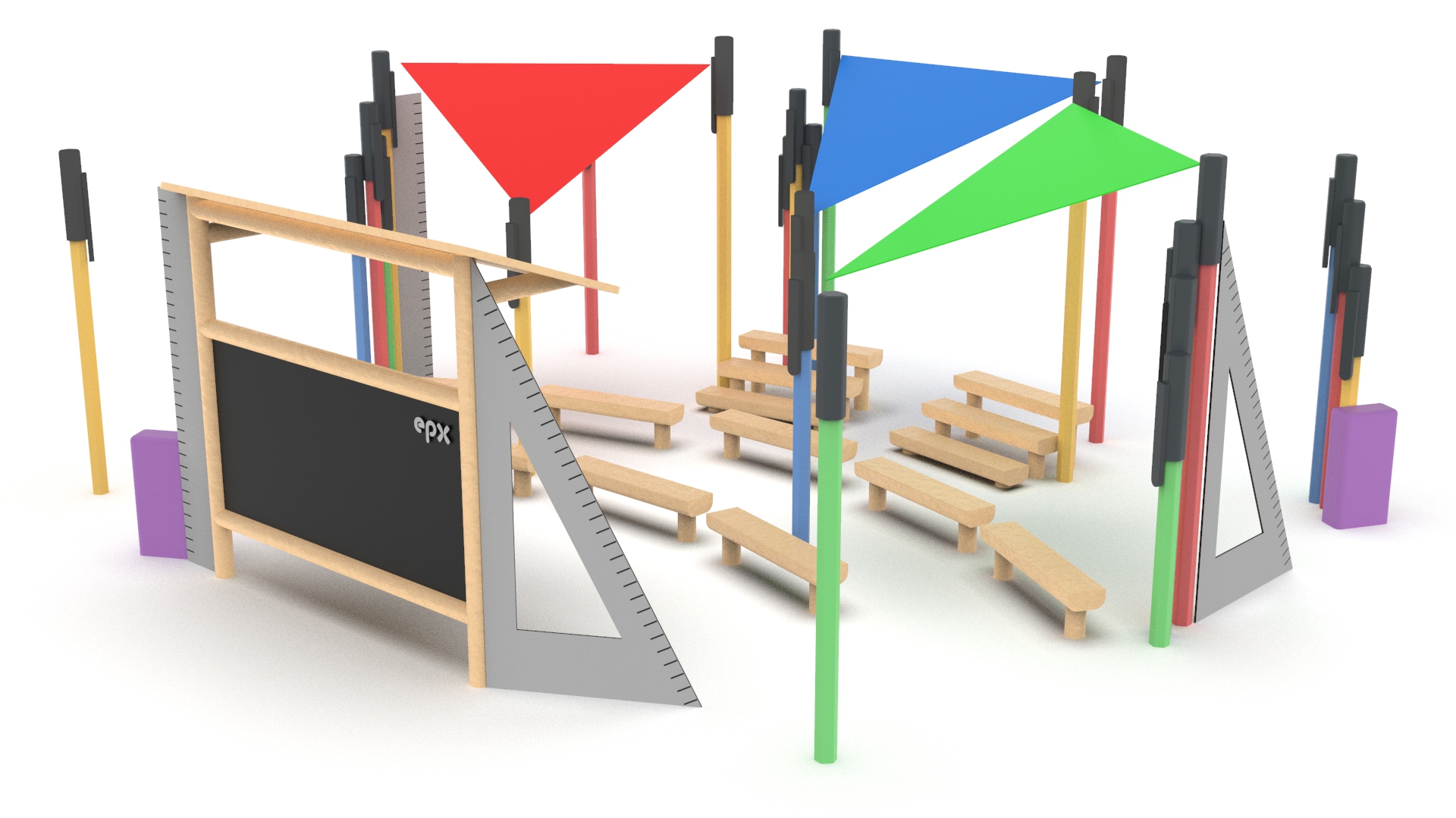 Komplekt sisaldab mugavaid istumiskohti ning varjualuseid, mis pakuvad kaitset päikese ja kergete sademete eest. Tänu läbimõeldud disainile sobib lahendus ideaalselt koolide, lasteaedade ja avalike mängu- ning puhkealade juurde.